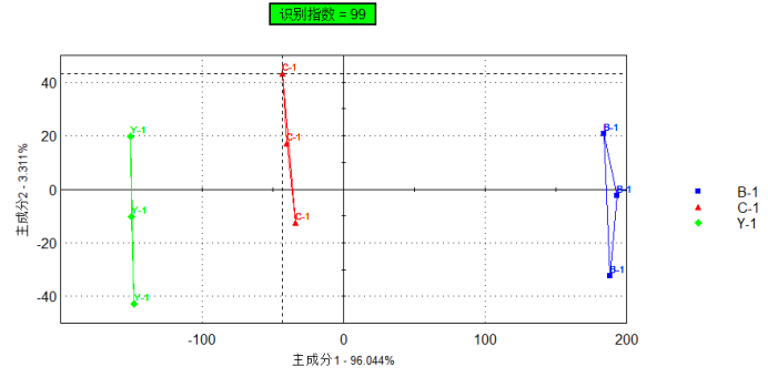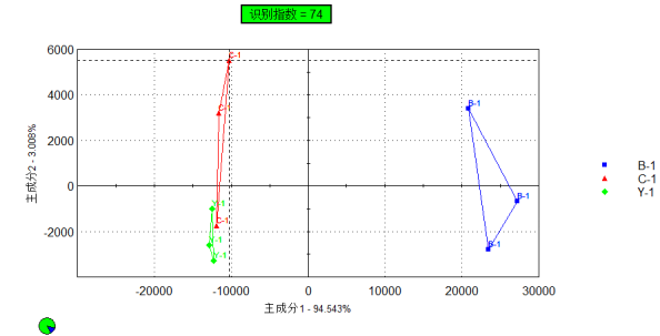 指紋分辨指數是根據主成分分析圖中的兩個樣品組間的相對距離計算得出,兩個樣品組間的距離越大,則兩個樣品組的指紋分辨指數越接近100%,即指紋分辨指數越大,樣品組間的區別越大。如表1所示,樣品B-1與Y-1間的指紋分辨指數較大,說樣品B-1與Y-1的差異較大,而樣品C-1與Y-1間的差異較小,即樣品C-1與Y-1間香氣更加接近。