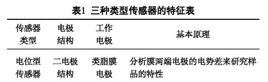 電子舌技術(shù)已經(jīng)被應(yīng)用到各個領(lǐng)域,同時在對不同領(lǐng)域的不同樣品進(jìn)行檢測時,對味覺傳感器陣列的要求會有所不同。目前在應(yīng)用的傳感器種類很多,根據(jù)其工作原理不同可分為電位型、伏安型、阻抗譜型、光尋址型、物理型以及生物傳感器等種類。我們查閱資料發(fā)現(xiàn)在食品研究中應(yīng)用最多的傳感器陣列主要是電位型、伏安型與阻抗譜型,三種類型傳感器的特征見表1。