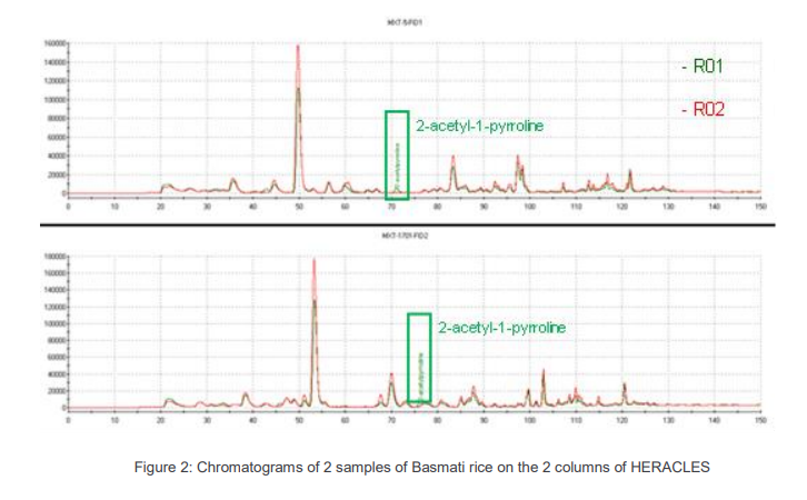 本研究表明,Heracles主成分分析可以在采集完樣品之后直接區分大米的氣味差異,同時此次實驗還成功地用于快速比較幾種大米樣品中2-乙酰基-1-吡咯啉的含量,以及氧化指標(己醛)的含量。