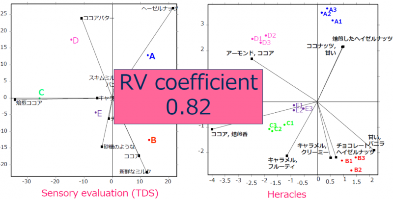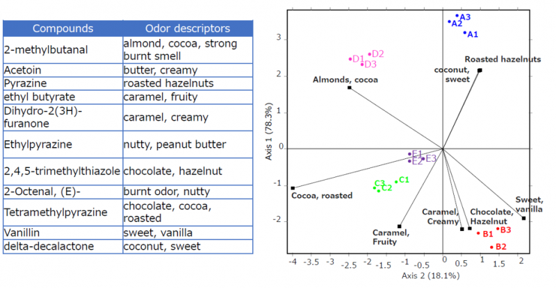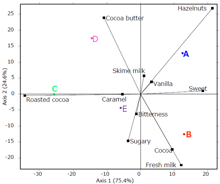 通過TDS持續時間生成的主成分分析圖:A,B,C,D,E 這幾個樣品都有不同的感官特征,比如A產品的榛子味濃一些,C產品的烤可可味更濃一些。