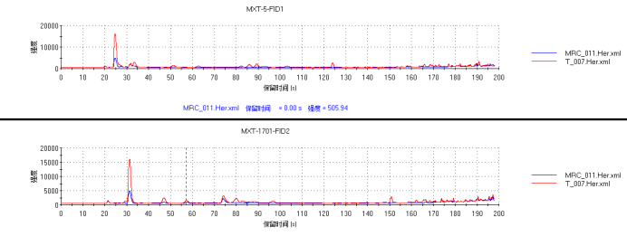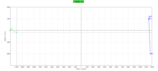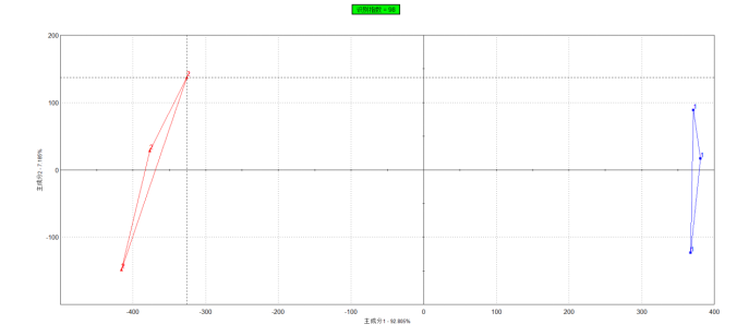 PCA是將采集到的氣味成分的種類和含量作為變量,通過向量變化以更直觀的形式體現樣品間的氣味組成差異,圖2為原始PCA圖(以所有色譜峰為變量)。第一主成分(PC1)與 第二主成分(PC2)的貢獻率之和達到了 99.6141%,能較為完整的代表樣品的全部信息;樣品間的差異主要反應在橫軸上距離的遠近(第一主成分貢獻率顯著 93.823%)。2個樣品在主成分分析圖上的區分指數達到(Discrimination Index)99,說明超快速氣相色譜電子鼻(Heracles)能夠基于氣味的差異,有效區分2個牛奶樣品。