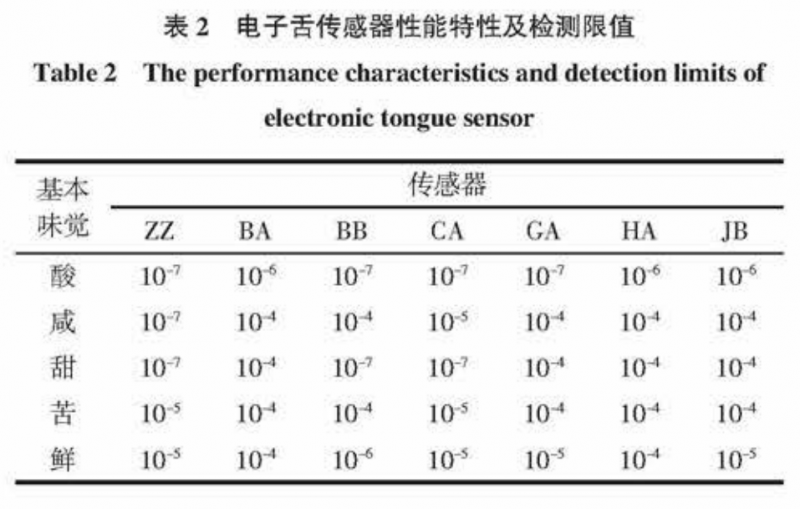 儀器:ASTREE型電子舌,法國 AlphaMOS公司,該電子舌由 7 根非專一性和一個(gè)Ag/AgCl參比電極組成,每根傳感器對(duì)酸、甜、苦和鮮味敏感程度不一樣,其傳感器特性及檢測(cè)限值見表 2。