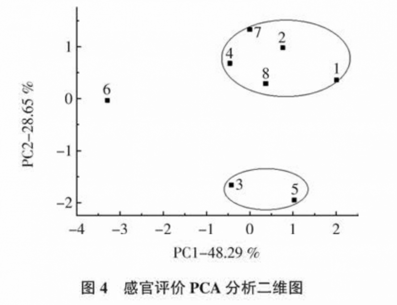 主成分 1、2 的貢獻(xiàn)度分別為48.29 % 、28.65 %,累計(jì)方差貢獻(xiàn)度為 76.94 % , 基本上上包含了樣品的大部分信息,從其二維圖上看,8 個(gè)樣品分 3 類:1、2、4、7、8為第一組;3、5為第二組;6為第三組。綜上所述,8 種功能飲料按電子舌與感官評(píng)價(jià)的差異可獲得較為一致的分組效果:1、2、4為第一組 ;3、5為第二組; 6 為第三組,但 7、8號(hào)樣品的分類存在差異。王俊魁等在采用感官評(píng)價(jià)和電子舌區(qū)分不同品牌韭菜花醬時(shí),認(rèn)為兩種方法對(duì)韭菜花醬滋味品質(zhì)區(qū)分效果相似,這與本文結(jié)論基本一致。