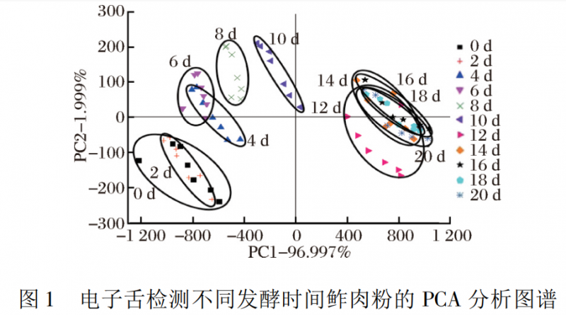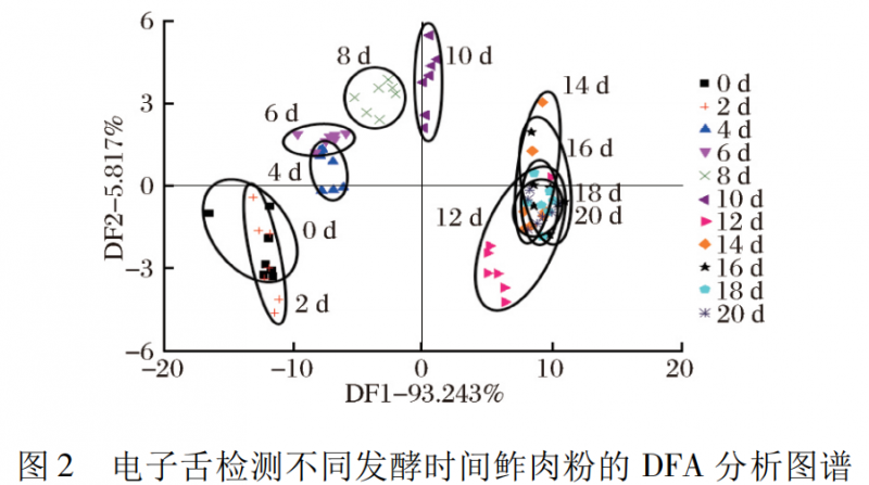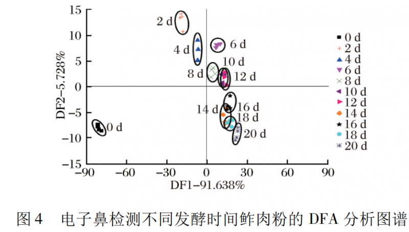 從圖 1 和圖 2 可以看出,在鲊肉粉發酵第 0 ~ 10 天,鲊肉粉樣品沿第一主成分增大的方向移動,說明隨著發酵時間的延長,鲊肉粉發酵產生的滋味物質也隨之改變,從 PCA 圖譜得出第 12 ~ 20 天絕大部分重疊在一起,說明鲊肉粉的滋味物質沒有明顯改變; 從DFA 圖譜得出第 12 ~ 16 天鲊肉粉從左下方向右上方移動且小部分與第 18 天和第 20 天重疊,說明鲊肉粉在中后期鲊肉粉滋味物質隨時間延長而改變至趨于穩定,經對比分析,DFA 比 PCA 能更好地分析隨時間改變鲊肉粉滋味物質的不同。