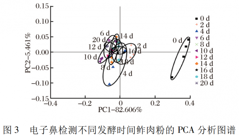 綜合電子鼻的 PCA 和 DFA 2 張圖譜可以看出,第 0 天的鲊肉粉顯著區分于其他樣品,從 PCA 圖譜得出第 2 ~ 20 天絕大部分重疊在一起,說明鲊肉粉的氣味物質沒有明顯改變; 從 DFA 圖譜得出發酵第2 ~ 6 天、第 8 ~ 12 天、第 14 ~ 20 天鲊肉粉樣品均有所移動,說明 DFA 能更好區分隨時間的改變鲊肉粉氣味物質的不同。