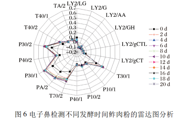 如圖 6 所示,傳感器 T40 /2、P30 /2、P40 /2、P30 / 1、PA/2、T70 /2 和 T30 /1 響應信號的強度均隨鲊肉粉發酵時間的增加而增強,傳感器 P30 /2、P30 /1、PA/2、 T70 /2 和 T30 /1 對各組鲊肉粉樣品的響應值都較大,且發酵第 0 天和其他發酵時間響應值有差異顯著,說明第 0 天的鲊肉粉樣品中的揮發性風味成分與其他發酵時間的鲊肉粉樣品顯著不同; 傳感器 LY2 /LG 的信號強度隨鲊肉粉發酵時間的增加而減弱; 傳感器T40 /1、TA/2、LY2 /G、LY2 /AA、LY2 /GH 和 LY2 / gCTL 對不同發酵時間鲊肉粉的響應值基本一致,傳感器 LY2 /gCT、P10 /1 和 P10 /2 對不同發酵時間鲊肉粉樣品的響應值雖有差異,但無明顯規律。