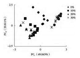 圖1 核桃油和菜籽油的電子舌傳感器響應(yīng)信號圖 核桃油中摻入菜籽油的PCA分析 核桃油中摻入菜籽油的PCA分析圖如圖2所示。結(jié)果表明,第1主成分(PC1)的貢獻率為49.843%,第2主成分(PC2)的貢獻率為20.811%,2個主成分的總貢獻率達到70.654%(>70%),表明所提取的信息能夠反映原始數(shù)據(jù)的大部分信息。純核桃油和其他摻假樣品的數(shù)據(jù)點分布較遠,區(qū)分明顯,但是摻入菜籽油質(zhì)量分?jǐn)?shù)10%~50%的摻假樣品的數(shù)據(jù)點分布較接近,各區(qū)域重疊嚴(yán)重,難以區(qū)分。這說明電子舌技術(shù)結(jié)合PCA分析方法可將摻假核桃油與純核桃油區(qū)分開來。