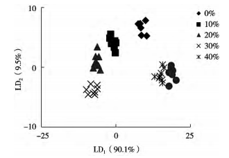 圖2 核桃油中摻入菜籽油的PCA分析圖 核桃油中摻入菜籽油的LDA分析 核桃油中摻入菜籽油的LDA分析圖如圖3所示。結(jié)果表明,純核桃油和其他摻假樣品的數(shù)據(jù)點分布較遠,菜籽油質(zhì)量分?jǐn)?shù)0~50%的摻假樣品之間也區(qū)分明顯。核桃油中摻入菜籽油的含量不同,分布也不同,且分布位置隨著菜籽油含量的增多呈現(xiàn)逆時針的變化,這表明不同摻假樣品在菜籽油摻入質(zhì)量分?jǐn)?shù)大于10%時即能區(qū)分開來,且能通過摻假樣品在LDA分析圖中的位置判斷出摻入菜籽油的質(zhì)量分?jǐn)?shù),這表明電子舌技術(shù)結(jié)合LDA分析方法既能對核桃油中摻入菜籽油的現(xiàn)象進行定性分析,也可對其進行定量分析。