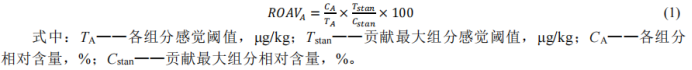 抓飯,市售;Asrree Ⅱ/LS16電子舌、HERACLES Ⅱ電子鼻,氣質(zhì)聯(lián)用儀。 樣品粉碎,稱取1g樣品于20g樣品瓶中,迅速用專用瓶蓋壓蓋密封,電子鼻測定參數(shù):清洗時間120s,樣品準(zhǔn)備時間10s,測定時間120s,載氣流速150mL/min,每組樣品測定5次,取最后3次穩(wěn)定數(shù)據(jù)進(jìn)行分析。 稱取7.5g樣品定容至120mL,振蕩混勻,常溫振蕩孵育30min,4000r/min離心15min,上清液過濾后上機(jī)測定。數(shù)據(jù)采集前,對電子舌進(jìn)行傳感器活化、校準(zhǔn)等操作,確保檢測數(shù)據(jù)的可靠性與穩(wěn)定性。將100mL濾液置于電子舌專用容器中,樣品采集與清洗交替進(jìn)行每兩個樣品間放1杯100mL的蒸餾水,清洗10s,樣品采集時間120s,重復(fù)7次,取后4次試驗(yàn)數(shù)據(jù)。 采用頂空固相微萃取法進(jìn)行樣品處理,稱取2g樣品,放入20mL帶有硅膠墊帽的頂空萃取瓶中,立即密封,萃取溫度60℃,平衡15min,頂空吸附45min。250℃解析5min。 利用ROAV定義對樣品風(fēng)味貢獻(xiàn)最大的揮發(fā)性風(fēng)味物質(zhì),即ROAVmax=100,其它揮發(fā)性成分ROAV按式(1)計(jì)算。