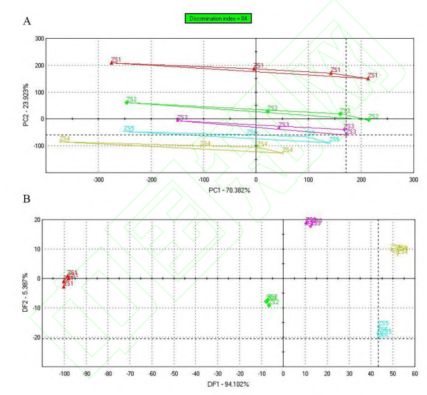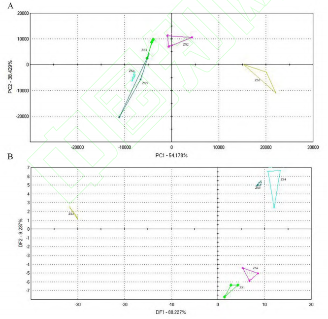 5種抓飯電子鼻檢測主成分分析PCA結(jié)果如圖1所示,第1主成分區(qū)分貢獻(xiàn)率為54.178%,第2主成分區(qū)分貢獻(xiàn)率為38.429%,2個主成分累計(jì)貢獻(xiàn)率92.607%,總貢獻(xiàn)率超過85%表明試驗(yàn)方法的可行性,說明PC1和PC2兩軸包含了PCA轉(zhuǎn)換中絕大部分的貢獻(xiàn)率,主要成分可以較好地反映原來多指標(biāo)的信息。ZS4和ZS5判別指數(shù)為7.4%,表明這兩個抓飯的香氣高度相似。判別因子分析DFA分析可知,不同抓飯?jiān)贒FA圖中分別有各自的區(qū)域并且沒有重疊。其中主成分1(DF1)的貢獻(xiàn)率達(dá)到了88.227%,主成分2(DF2)的貢獻(xiàn)率達(dá)到了9.237%,主成分1(DF1)和主成分2(DF2)的累積方差貢獻(xiàn)率為97.464%,包含了樣品絕大部分信息,說明用DFA來表示電子鼻整體信息非常可信。電子鼻結(jié)合DFA可以很好地區(qū)分5種市售抓飯。