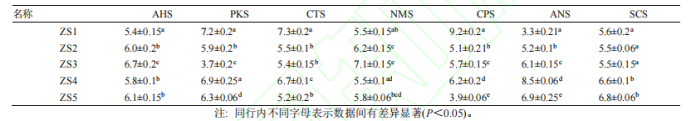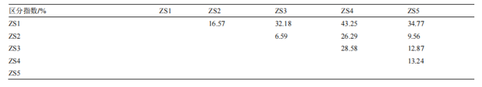 表1是5個不同品種抓飯電子舌區(qū)別指數(shù)分析,ZS2、ZS3、ZS5區(qū)別指數(shù)分別為6.59,9.56,12.87,距離值最小,可知三者味覺的相似性較大。ZS1和ZS4的距離值最大43.25,可知兩者的相似性最小。