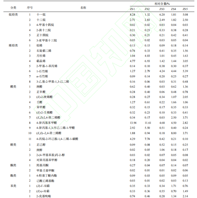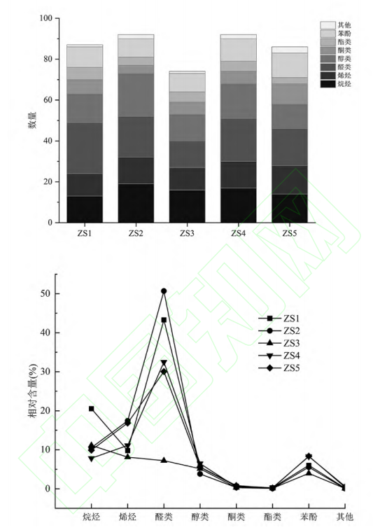 GC-MS檢測揮發(fā)性物質(zhì)種類與含量 5種市售抓飯共鑒定出132種化合物,其中包括烷烴(25種)、烯烴(16種)、醛類(27種)、醇類(26種)、酮類(11種)、酯類(9種)、苯酚類(15種)、其它(3種)。從圖4可以看出,ZS1鑒定出87種,其中醛類(43.31%)、烷烴(20.54%)相對含量較高;ZS2鑒定出92種,其中醛類(50.68%)、烯烴(17.41%)、烷烴(10.53%)相對含量較高;ZS3鑒定出74種,其中烷烴(11.11%)、烯烴(8.11%)相對含量較高;ZS4鑒定出92種,其中醛類(32.47%)、烯烴(11.12%)相對含量較高;ZS5鑒定出86種,其中醛類(30.04%)烯烴(16.85%)相對含量較高。