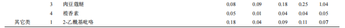 圖4 不同抓飯揮發(fā)性成分分類和相對含量統(tǒng)計(jì) 5組抓飯GC-MS分析如表4所示,共檢測出共有揮發(fā)性風(fēng)味物質(zhì)39種,主要包括:烷烴類(6種)相對平均含量7.67%,烯烴類(8種)相對平均含量10.25%、醛類(11種)相對平均含量19.58%、醇類(4種)相對平均含量0.66%、酯類(2種)相對平均含量0.1%、酮類(2種)相對平均含量0.14%、雙萜類(2種)相對平均含量1.39%、其它(4種)相對平均含量1.46%。5組抓飯共有化合物相對平均含量為41.252%。相對平均含量超過1%的化合物有10種分別為:十一烷(4.54%)、十二烷(2.47%)、月桂烯(4.54%)、萜品烯(3.52%)、1-石竹烯(3.63%)、(E,Z)-2,4-癸二烯醛(1.35%)、4-異丙基苯甲醛(7.51%)、4-異丙基-1,3-環(huán)己二烯-1-甲醛(1.91%)、反式-2,4-癸二烯醛(2.94%)、4-丙烷-2-環(huán)己胺-1,4-二烯-1-碳醛(2.55%),這10種化合物相對總含量達(dá)到34.96%,占共有化合物相對含量的84.7%。 表3 基于氣相色譜質(zhì)譜(GC-MS)鑒定抓飯共有揮發(fā)性成分