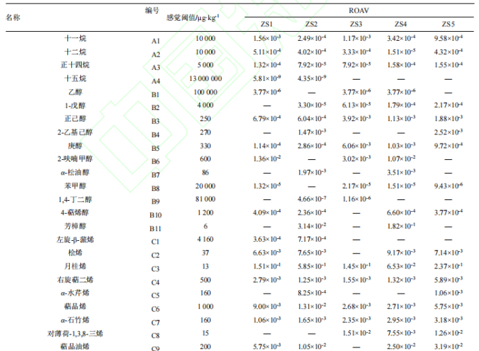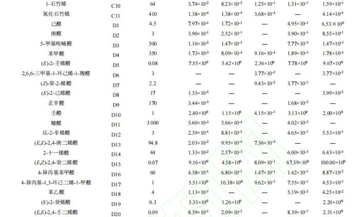 根據(jù)文獻(xiàn)查閱感覺閾值并計(jì)算抓飯香氣成分ROAV,本研究只針對能查到感覺閾值的化合物。篩選ROAV大于0.1的揮發(fā)性物質(zhì)分析,結(jié)果如表4所示,(E,Z)-2,4-癸二烯醛對抓飯香氣貢獻(xiàn)最大,定義其為ROAVmax=100,ROAV≥1的物質(zhì)對抓飯香氣貢獻(xiàn)較大,0.1≤ROAV<1的物質(zhì)對抓飯香氣有重要的修飾作用。月桂烯、1-石竹烯、己醛、庚醛、(E)-2-壬烯醛、反-2-辛烯醛、壬醛、(E,Z)-2,4-癸二烯醛、4-異丙基苯甲醛、4-異丙基-1,3-環(huán)己二烯-1-甲醛、苯乙醛、(E)-2-癸烯醛、(E,E)-2,4-壬二烯醛、(E,E)-2,4-癸二烯醛、(E)-2-庚烯醛、α-紫羅酮、β-紫羅酮、2-正戊基呋喃18種化合物ROAV大于0.1,為抓飯香氣主要香氣成分。其中(E,Z)-2,4-癸二烯醛、(E,E)-2,4-癸二烯醛、4-異丙基-1,3-環(huán)己二烯-1-甲醛、(E)-2-癸烯醛、壬醛、(E)-2-壬烯醛、β-紫羅酮7種化合物ROAV大于1,為抓飯關(guān)鍵香氣成分,其余11種化合物對抓飯香氣具有重要修飾作用。 表4 抓飯揮發(fā)性風(fēng)味物質(zhì)的香氣閾值及ROAV