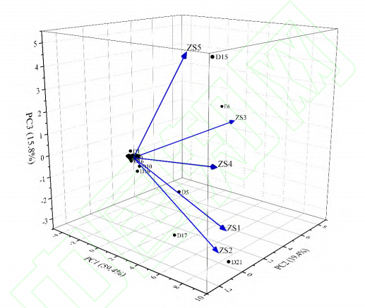 為進(jìn)一步研究抓飯揮發(fā)性成分的變化,采用主成分分析法對抓飯ROAV進(jìn)行分析。由圖5可知,第一主成分方差貢獻(xiàn)率為59.4%,第二主成分方差貢獻(xiàn)率為19.4%,第三主成分方差貢獻(xiàn)率為15.8%,前3個主成分方差累計(jì)率為94.6%,表明3個主成分能夠代表原始數(shù)據(jù)的信息。在第一主成分上,D5[(E)-2-壬烯醛]、D10(壬醛)、D15[(E,Z)-2,4-癸二烯醛]、D19[(E)-2-癸烯醛]、D21[(E,E)-2,4-癸二烯醛]、E6(β-紫羅酮)為正影響,其余為負(fù)影響;在第二主成分上,D5[(E)-2-壬烯醛]、D10(壬醛)、D17(4-異丙基-1,3-環(huán)己二烯-1-甲醛)、E6(β-紫羅酮),D15[(E,Z)-2,4-癸二烯醛]較高負(fù)影響;在第三主成分上,D1(己醛)、D15[(E,Z)-2,4-癸二烯醛]、E6(β-紫羅酮)較高整影響,C3(月桂烯)、D2(庚醛)、D5[(E)-2-壬烯醛]、D10(壬醛)、D16(4-異丙基苯甲醛)、D17(4-異丙基-1,3-環(huán)己二烯-1-甲醛)、D19[(E)-2-癸烯醛]、D21[(E,E)-2,4-癸二烯醛]為負(fù)影響。表明這些揮發(fā)性物質(zhì)可能是影響不同市售抓飯風(fēng)味差異的關(guān)鍵物質(zhì)。