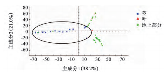 將所得數據用AlphaSoft軟件進行PCA,見圖2。結果發現主成分1(PC1)與主成分2(PC2)的累計R2=59.2%,說明模型的PC1與PC2體現了樣品絕大部分的變量信息,所收集的50批穿心蓮樣品較為清楚地分為2部分,穿心蓮的莖大多數在縱軸的左邊,除了樣品莖S7,S29,S41,S49,S50分布在縱軸右側,但是這幾個樣品離縱軸左側最近。而縱軸右側主要為葉和地上部分,其中樣品葉S9~S13均分布在縱軸右側上方。