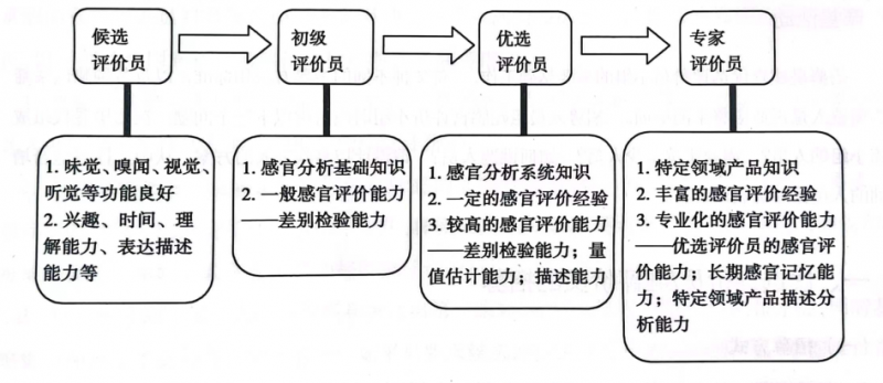 在感官評價的實踐中,往往根據不同檢驗的要求選用不同級別的評價員,不同級別的評價員要求如下: