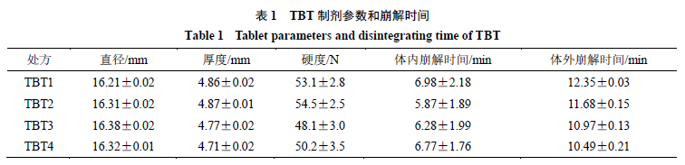 含片硬度、崩解時(shí)間的測(cè)定 采用游標(biāo)卡尺測(cè)定TBT的厚度和直徑,片劑測(cè)試儀測(cè)量片劑的硬度。崩解時(shí)間的測(cè)定選取12名健康志愿者(20~30歲,來自成都中醫(yī)藥大學(xué))評(píng)價(jià)。將片劑含于口腔內(nèi),直到片劑崩解完全,記錄時(shí)間,得到其體內(nèi)崩解時(shí)間;將900 mL水加熱維持在(37.0±0.5)℃,作為崩解介質(zhì),采用崩解儀測(cè)定含片的體外崩解時(shí)間。TBT的基本制劑質(zhì)量參數(shù)見表1。掩味后2種含片的外觀直徑略大于原片,厚度變小,可能是由于硬度變小所導(dǎo)致。4種含片的體內(nèi)崩解時(shí)間與體外崩解時(shí)間差異較大,可能是由于人體測(cè)試過程中會(huì)不自主的摩擦攪拌含片,故崩解時(shí)間縮短。4種TBT的體外崩解時(shí)間均能滿足口含片不在10 min內(nèi)全部崩解或溶化的要求。