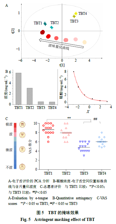 (2)感官分析驗(yàn)證:采用視覺模擬量表法(visual analogue scale,VAS)進(jìn)行評(píng)估。感官評(píng)價(jià)小組由來自成都中醫(yī)藥大學(xué)的健康志愿者(20~26歲,味覺正常,無抽煙、酗酒史)構(gòu)成,實(shí)驗(yàn)經(jīng)過成都中醫(yī)藥大學(xué)附屬醫(yī)院倫理委員會(huì)(批準(zhǔn)編號(hào):2014KL016)審核批準(zhǔn)。首先,采用酸(檸檬酸)、苦(奎寧)、甜(蔗糖)、咸(氯化鈉)、鮮(谷氨酸鈉)、澀(鞣酸)6種味覺溶液測(cè)試志愿者的味覺靈敏度;再用鞣酸溶液(0.062 5、0.125、0.25、0.5、1、2、4、8 mg/mL)訓(xùn)練志愿者對(duì)澀味強(qiáng)度的認(rèn)知,熟悉評(píng)價(jià)標(biāo)準(zhǔn)。最終,15名志愿者(5名男性和10名女性)參加TBT的澀味評(píng)估。志愿者將口含片置于口腔內(nèi),含服至無顆粒感,根據(jù)量表的標(biāo)尺評(píng)分。樣品測(cè)試間隔,用純水沖洗口腔至無澀味感,并給予一定時(shí)間休息。