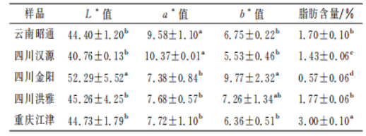 采用全自動色差儀測量魚片表面的顏色,每次測試前進(jìn)行校準(zhǔn)。測量白度(L*值)、紅度(a*值)和黃度(b*值)。不同產(chǎn)地的青花椒對花椒魚片的色澤和脂肪含量的影響不同,結(jié)果見表2。