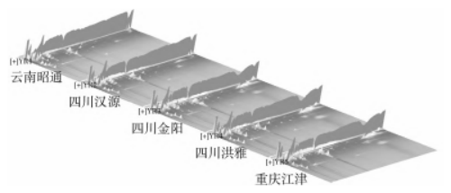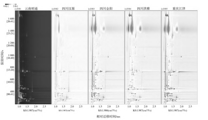 青花椒產(chǎn)地對花椒魚片風(fēng)味物質(zhì)的影響花椒魚片樣品的揮發(fā)性物質(zhì)GC-IMS三維圖譜見圖2。圖2中每個反應(yīng)離子峰代表一種揮發(fā)性風(fēng)味物質(zhì),顏色越深,表示物質(zhì)越豐富。使用不同產(chǎn)地的青花椒制作花椒魚片時,可以直觀地看到四川金陽和重慶江津樣品組中風(fēng)味物質(zhì)的種類和濃度與其他樣品組差異較明顯。花椒魚片特征性風(fēng)味成分GC-IMS差異譜圖見圖3,此圖是將圖2的三維圖投影到二維平面上的俯視圖,具體是以氣相色譜的保留時間作為縱坐標(biāo),以離子遷移時間作為橫坐標(biāo),以云南昭通青花椒樣品組譜圖為參比,將另外4個樣品組的譜圖扣減參比后得到的。差異圖譜中每個點(diǎn)代表一種揮發(fā)性風(fēng)味物質(zhì)。結(jié)果顯示,與云南昭通樣品組相比,四川金陽和重慶江津樣品組的風(fēng)味物質(zhì)濃度較高。