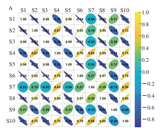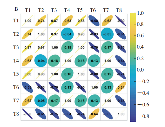 特征變量之間存在高沖突數(shù)據(jù)會影響特征融合數(shù)據(jù)的可靠性,繼而會影響分類模型建模結(jié)果,而Pearson相關(guān)系數(shù)在度量數(shù)據(jù)之間的沖突程度上表現(xiàn)良好。以整根粉10 根傳感器響應(yīng)值的INV特征數(shù)據(jù)和整根粉單個傳感器S2響應(yīng)值的8 個特征數(shù)據(jù)為例分析特征數(shù)據(jù)之間的冗余程度。圖2是這兩種不同維度數(shù)據(jù)各自的Pearson相關(guān)矩陣,其中相關(guān)系數(shù)的絕對值越接近1,說明二者之間的相關(guān)性越大;相關(guān)系數(shù)的大小在圖中用橢圓形球的寬窄和顏色表示,正負(fù)用橢圓形球的左偏和右偏表示。由圖2A可知,除S7、S9傳感器外,其余8 個傳感器之間都存在大量冗余信息;由圖2B可知,除了最大值特征T4和BFV b特征T7外,其余6 個特征數(shù)據(jù)之間存在大量冗余信息。所以,需要對特征數(shù)據(jù)進(jìn)行特征降維提高分類模型的精度。
