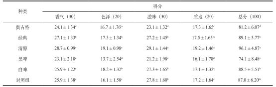 1.啤酒種類對(duì)啤酒鴨感官評(píng)分的影響