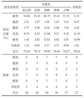 通過(guò)GC-MS測(cè)定不同種類啤酒制作啤酒鴨樣品的風(fēng)味物質(zhì)及其相對(duì)含量。各樣品鑒得醇類、酯類、醛類、酮類、烴類以及其他類(醚類、含氮類及呋喃等)揮發(fā)性化合物,其中來(lái)源于啤酒的醇類物質(zhì)占據(jù)實(shí)驗(yàn)組最重要位置。由表3可知,實(shí)驗(yàn)組所檢測(cè)的揮發(fā)性化合物,各樣品風(fēng)味物質(zhì)含量皆不同,但醇類和烴類都為其主要化合物,種類及含量皆高于對(duì)照組。
