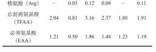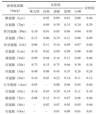 由表4可知,啤酒鴨中共檢測(cè)到16種游離氨基酸,其7種人體必需氨基酸中苯丙氨酸、蘇氨酸、異亮氨酸、亮氨酸、纈氨酸在所有啤酒鴨中均有檢出。清醇組及清水對(duì)照組中各氨基酸均能檢出(16種),白啤組氨基酸種類次之(15種),種類最少為奧古特組(11種)。