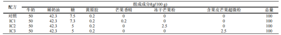 冰淇淋是一種風靡全球的甜點,它以其豐富細膩的口感、多樣的口味和令人愉悅的冰涼感受而備受喜愛。隨著人們對營養健康的關注增加,低脂、低糖、天然營養功能組分添加的營養健康型冰淇淋產品越來越受到消費者的青睞。本研究以添加果皮的芒果超微粉為原料,對比研究了含果皮芒果超微粉、市售凍干芒果粉和芒果香精添加對冰淇淋的感官、風味、理化性質的影響。