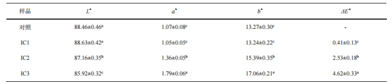 與對照組相比,在色澤上IC1組和對照組之間沒有顯著差異(P>0.05),說明添加香精不會改變冰淇淋的色澤。添加芒果粉后冰淇淋樣品的L*值顯著減小,a*值、b*值和ΔE*值顯著增大(表2),這表明添加芒果粉會導致冰淇淋的亮度降低,顏色逐漸偏向紅色和黃色。通過圖1中可以觀察到,IC3組的亮度比IC2組更低,紅色和黃色更深。在添加芒果粉后,冰淇淋的色澤由乳白色變為淡黃色,這表明不同的呈味物質會對冰淇淋的視覺特性產生明顯影響,進而影響消費者對產品的整體感知。