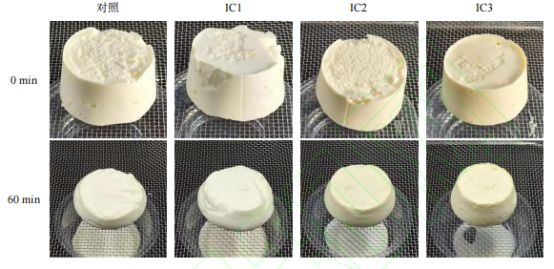 如表3所示,IC1組與對照組在硬度、黏著性、彈性、咀嚼性、膠著性、內聚性和回復性特性方面均無顯著差異(P>0.05),說明添加香精對冰淇淋的質構無顯著影響。而IC2組和IC3組的硬度略有降低,但差異不顯著,其黏著性、彈性和咀嚼性顯著高于對照組。黏著性、彈性和咀嚼性的提高說明添加芒果粉增強了冰淇淋在受力擠壓后的回彈能力,并增加了冰淇淋在口腔中的咀嚼次數,延長了口腔中芒果和牛奶味道的感知時間,有利于提高口腔對于芒果和牛奶味道的感知,同時也會賦予冰淇淋以更光滑的口感。而在膠著性、內聚性和回復性方面,IC2組和IC3組冰淇淋與對照組間無顯著差異(P>0.05)。