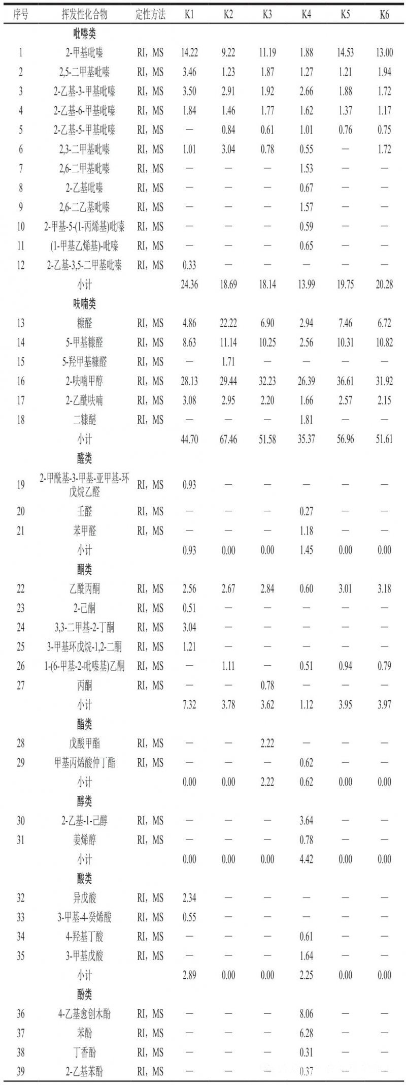 02 不同咖啡的滋味輪廓分析利用電子舌快速分析滋味輪廓,如圖2A所示。6種樣品的雷達圖輪廓類似,只有酸味傳感器的響應值為負,說明酸味對咖啡整體滋味的貢獻較小。各樣品在鮮味與咸味傳感器上的響應值差異最大,表明這兩種傳感器對滋味特征的區分效果最好。為根據滋味特征進一步區分6種咖啡,對電子舌傳感器響應值結果進行PCA(圖2B)。6種咖啡輪廓未重疊,滋味特征明顯,易被區分。K3、K5和K6咖啡在PC1的正方向,主要受鮮味、咸味、厚味影響;K1、K2和K4咖啡在PC1的負方向,主要由澀味、酸味、苦味影響(圖2C)。每個樣品聚類的距離與滋味特征接近度相關,有相同咖啡配比的K1~K4樣品,烘焙程度不同,距離較遠,說明電子舌可以區分不同烘焙度的咖啡。K5、K6咖啡分別與K1、K3咖啡輪廓接近,說明不同的咖啡配比在一定程度上能夠彌補烘焙程度的差異,使不同烘焙度的咖啡具有類似的滋味輪廓。