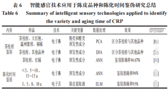 智能感官技術(shù)作為新興的快速分析技術(shù),采用電子傳感器模擬生物的嗅覺及味覺系統(tǒng),從而使樣品的檢測(cè)客觀化、智能化。其中的電子鼻和電子舌技術(shù)應(yīng)用于陳皮品種和陳化時(shí)間鑒偽的研究總結(jié)見下表。