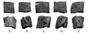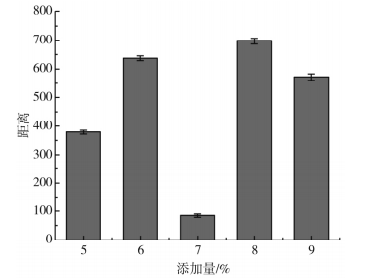 樣品原料擠壓前為金黃色,擠壓過程中高溫條件的非酶促褐變反應,例如美拉德反應和焦糖化反應,以及辣椒的顏色混合導致擠出物具有紅棕色。由圖1可知,隨著辣椒添加量的增加,樣品的紅色越來越深,樣品表面及內部的辣椒顆粒分布均勻并且越來越明顯。隨著辣椒添加量的增加,樣品中條狀纖維也越來越明顯。辣椒添加量小于7%時,樣品的拉絲性隨著辣椒添加量的增加越來越好,在辣椒添加量大于7%后,樣品的拉絲性隨著辣椒添加量的增加越來越差。