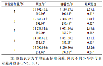 由表1可知,辣椒的添加明顯影響了植物蛋白肉的硬度,樣品的硬度呈先減小后增大的趨勢,辣椒添加量為9%時硬度最大,7%時硬度最小。植物蛋白肉的咀嚼性隨著辣椒添加量的增加呈先增大后減小的趨勢,辣椒添加量為7%的樣品的咀嚼性最大,辣椒添加量為9%的樣品的咀嚼性最小。當辣椒添加量小于7%時,樣品的組織化度隨著辣椒添加量的增加而增大,添加量大于7%時,組織化度隨著辣椒添加量的增加而減小。