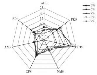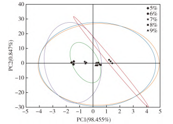 不同樣品酸味、甜味、苦味、咸味、鮮味5個滋味的排序見圖3,電子舌傳感器相對強度值存在明顯差異,表明電子舌測試可有效地區分不同樣品的滋味。5個樣品在ANS傳感器上的響應強度無明顯差異,在SCS、PKS、NMS、CTS、CPS、AHS傳感器上的響應強度存在差異,不同樣品的酸味、咸味、鮮味相對強度值從小到大的順序為酸味排序:6%<8%<9%<7%<5%,咸味排序:6%<9%<8%<7%<5%,鮮味排序:6%<8%<9%<7%<5%。