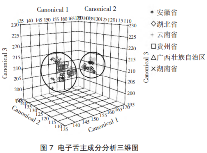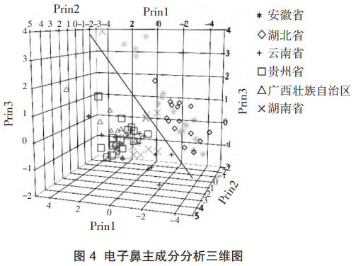 電子鼻主成分分析的結果表明,前三個主成分的特征值均大于1,其累積貢獻率達95.05%,由圖4可知,安徽和湖北的茯苓樣品存在較大的重疊,云南、貴州、廣西和湖南的樣品重疊更為嚴重。