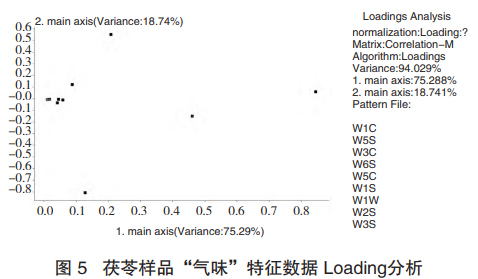 Loadings分析的算法與PCA的算法相同,是對傳感器的分析,得出傳感器區分樣品的能力。由圖分析可推測,各產地的茯苓樣品在氣味上的差異主要來自于無機硫化物、有機硫化物、甲基類化合物和氮氧化合物。