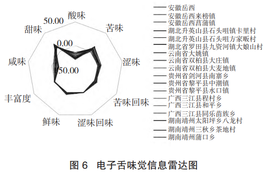 不同于以往人們對茯苓滋味的認識,茯苓樣品除咸味、酸味外,其他的味覺屬性基本都在無味點以上,說明茯苓具有豐富的味覺信息。茯苓最突出的味道是甜味和苦味。另外,不同產地茯苓的某些味覺屬性在雷達圖上重疊度較低,如酸味、澀味和苦味的回味,但各個產地的樣品酸味響應值在無味點-13以下,見圖6。