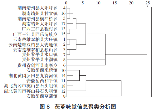 圖7為電子舌檢測結果的響應值降維后所得的主成分分析結果??傮w來看,西南地區(云南、廣西、貴州)的茯苓樣品與岳西地區(安徽、湖北)的茯苓樣品能夠得到大致劃分。