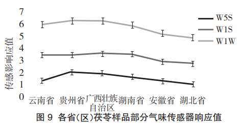 從茯苓氣味的PCA分析結果可知,在地理位置上以長江為分界點,能有效區分長江以北和長江以南的茯苓樣品。云南、貴州、廣西、湖南的樣品生長和采收于長江以南,湖北和安徽的樣品生長和采收于長江以北。根據雷達圖可知,W5S、W1S和W1W傳感器響應值較高,Loadings分析結果顯示茯苓氣味的差異主要來源于無機硫化物、有機硫化物、甲基類化合物和氮氧化合物。因此選擇對上述氣味靈敏的傳感器進一步分析茯苓氣味的產地差異,結果如圖9所示,安徽和湖北的茯苓樣品氣味響應值顯然低于云南、貴州、廣西、湖南的樣品,說明長江以北和長江以南的樣品在無機硫化物、有機硫化物、甲基類化合物和氮氧化合物氣味成分上存在較大差異。
