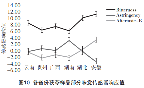 茯苓味覺信息的雷達圖分析可知,茯苓甜味顯著,但各產地之間差異不顯著。各產地的茯苓樣品味覺值的差異主要集中在苦味、澀味和苦味的回味上。因此,選擇苦味、澀味、苦味的回味進行分析探討產地之間的差異,結果如圖10所示。由圖可知,湖北和安徽的茯苓樣品苦味和苦味的回味都顯著高于長江以南——云南、貴州、廣西、湖南的茯苓樣品,且湖北和安徽的茯苓樣品苦味的回味在無味點0以上,長江以南的樣品苦味的回味都在無味點以下。對于澀味,長江以北的茯苓澀味在無味點以下,而長江以南的茯苓澀味都在人的無味點以上。