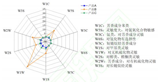 電子鼻分析結果為驗證不同霉莧菜梗風味差異,使用電子鼻的傳感器確定霉莧菜梗的風味成分分類。響應強度雷達圖(圖2)所示,產品A和C的傳感器響應強度較小,并且雷達圖線幾乎重合,但產品C的W1W傳感器響應強度略高于產品A。產品B的W1W傳感器響應強度達到最高,W2W、W5S、W1S和W2S傳感器響應強度相對較高,顯示無機硫化物、芳香成分、氮氧化合物、甲基類、醇類和醛酮類化合物的風味強度,產品B>產品C>產品A。這些結果說明,電子鼻可以有效地區分不同霉莧菜梗間的氣味物質差別。