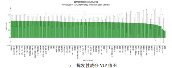 OPLS-DA是一種用于樣品判別分析的統計方法,有助于從大量代謝組學數據庫中篩選出差異性代謝物。OPLS-DA模型利用可變投影影響(VIP)評分來識別霉莧菜梗中的差異風味物質,VIP>1的物質是樣品中的差異代謝物。