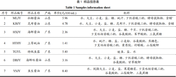 用于分析測試的海鮮調味汁分別為不同產地的典型代表性產品,分別為牡蠣醬油、昆布醬油、海鮮醬油、上等蠔油、特級魚醬油、釀造醬油、魚生醬油(上述樣品均為n=3),分別購自廣東廣州的超級市場和京東商城。樣品信息見表1。