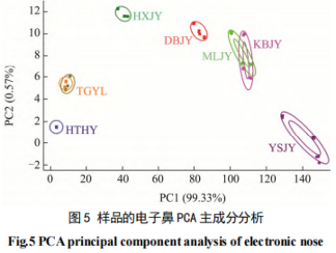 結合 PCA 貢獻率分析(根據電子鼻軟件內部的計算方式得到,數值越接近于1說明樣品的區分越顯著),由圖可見,HTHY 和 TGYL 兩個樣品與其余5個樣品之間的氣味差異明顯。5個JY樣品之間也存在明顯的氣味差異,其中KBJY和MLJY二者在氣味上非常接近;其余三者在圖中的落點也沒有重疊或者堆積在一處,可見氣味并不相似。