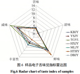 用智舌對7類樣品的滋味進行定性分析,將7類樣品的有效味覺指標數值做出雷達圖。從圖可以明顯看出7類樣品在咸味、鮮味和豐富性指標上存在明顯的差異,HTHY最鮮,TGYL最咸,而MLJY和DBJY滋味最為豐富。各類樣品在苦味和澀味方面的差異則相對較小。