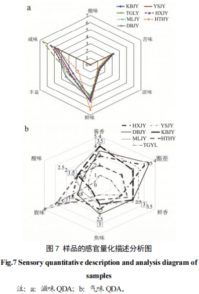 從圖a可知7類樣品的后味存在明顯差異,在咸味和鮮味指標上的感官評分也各不相同,然而在酸味、苦味和澀味這三項的味覺指標上則差異不大,尤其是酸味,感官評分均為0,說明評鑒員品嘗不出這7種樣品帶有酸味。