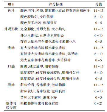 隨機挑選20人組成感官評價小組,從色澤、外觀形狀、香味、口感、滋味以及整體可接受度5個方面對氣流膨化青稞米進行評價,評分標準見表1。